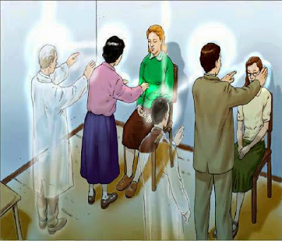 b) com a presença de um médium, servindo de polarizador, um Espírito desencarnado faz sobre o doente a aplicação, canalizando para ele os fluidos reparadores;